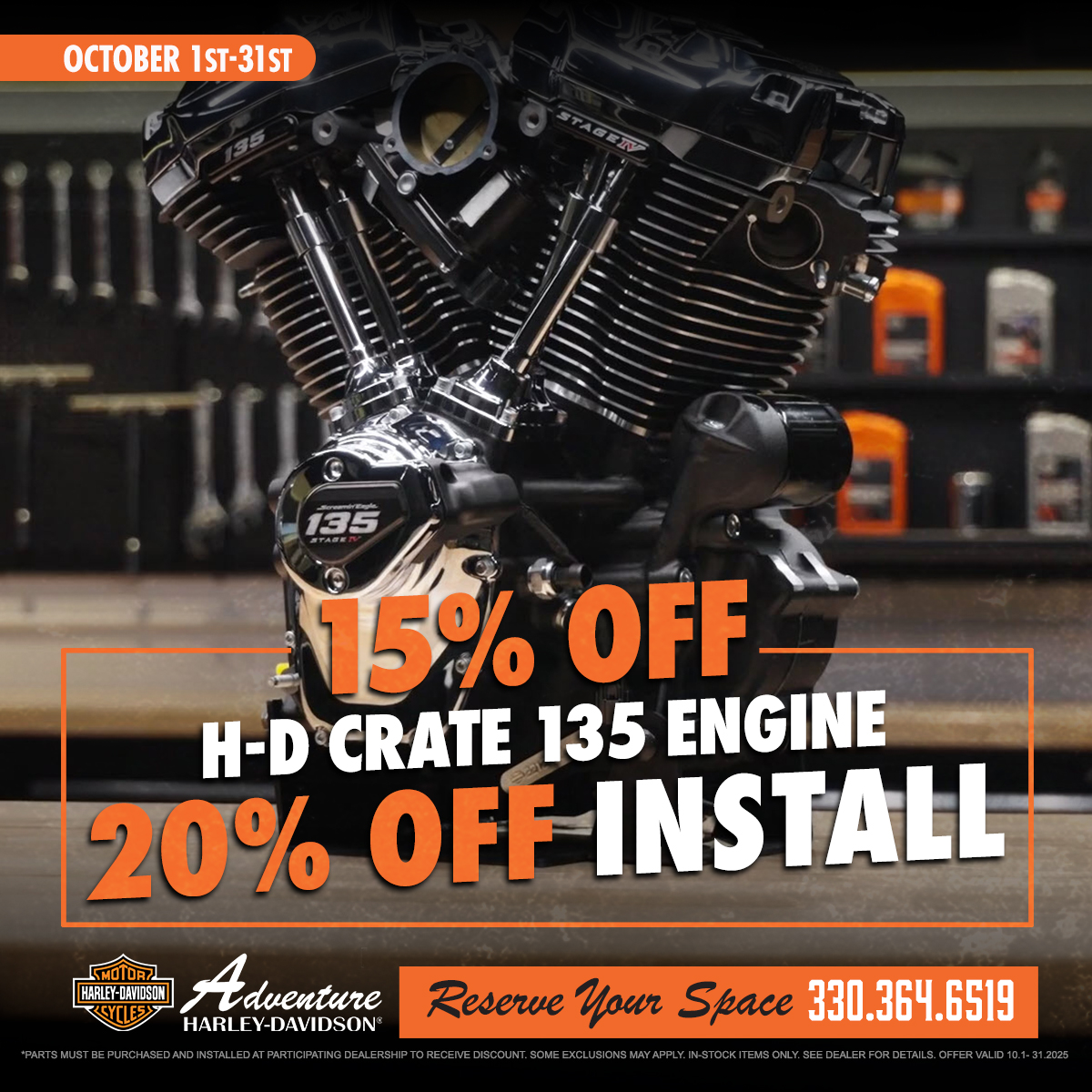 Upgrade your ride this October! Get 15% off the H-D Crate 135 Engine and 20% off installation at Adventure Harley-Davidson. Don’t wait—reserve your space today.