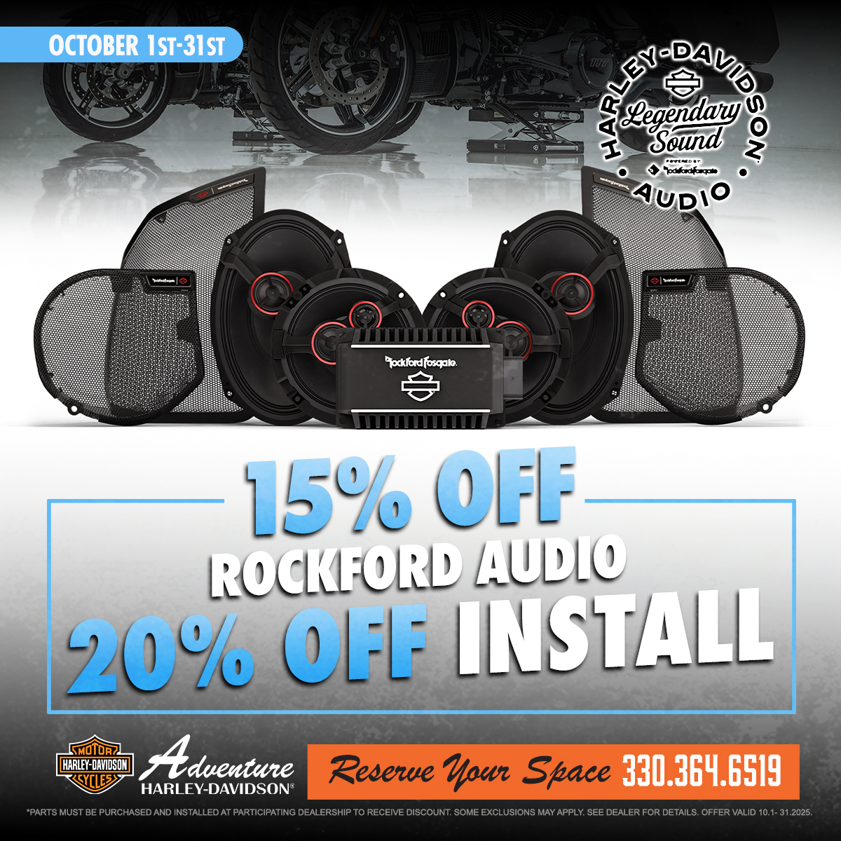 Turn it up this October! Save 15% on Rockford Audio and 20% on install at Adventure Harley-Davidson. Lock in your upgrade and request your parts today.*Parts must be purchased and installed at participating dealership to recieve discount. Some exclusions may apply. In-stock items only. See dealer for details. Offer valid 10.1-31.25