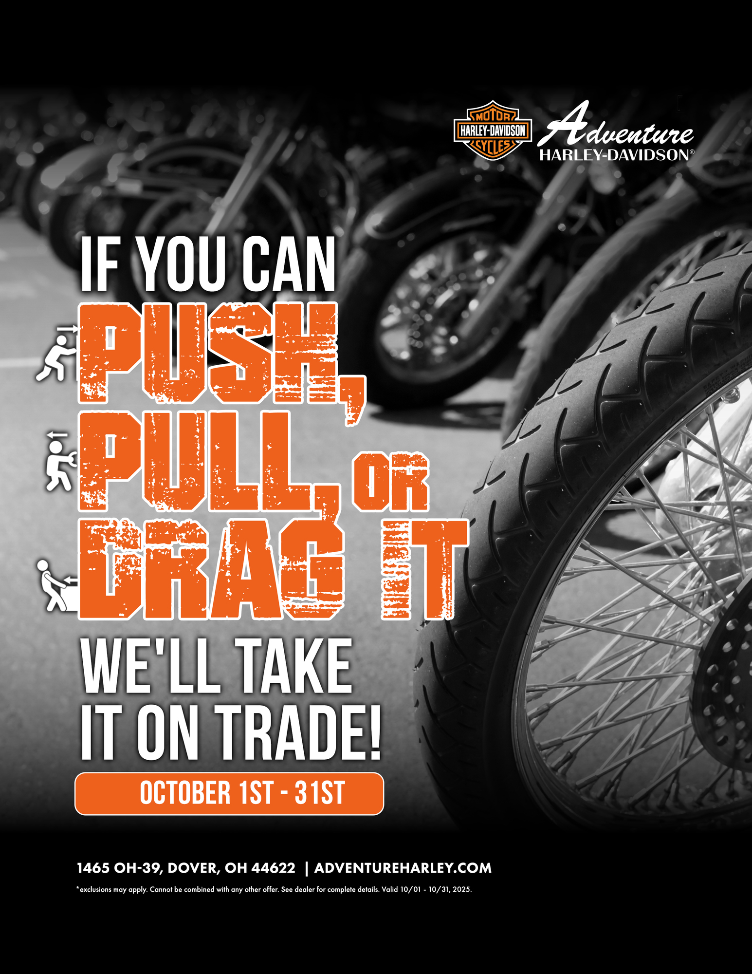 Push it, pull it, or drag it in—Adventure Harley-Davidson will take it on trade this October! No matter what shape it’s in, we’ll make it count. Offer valid October 1st–31st.Value Your Trade