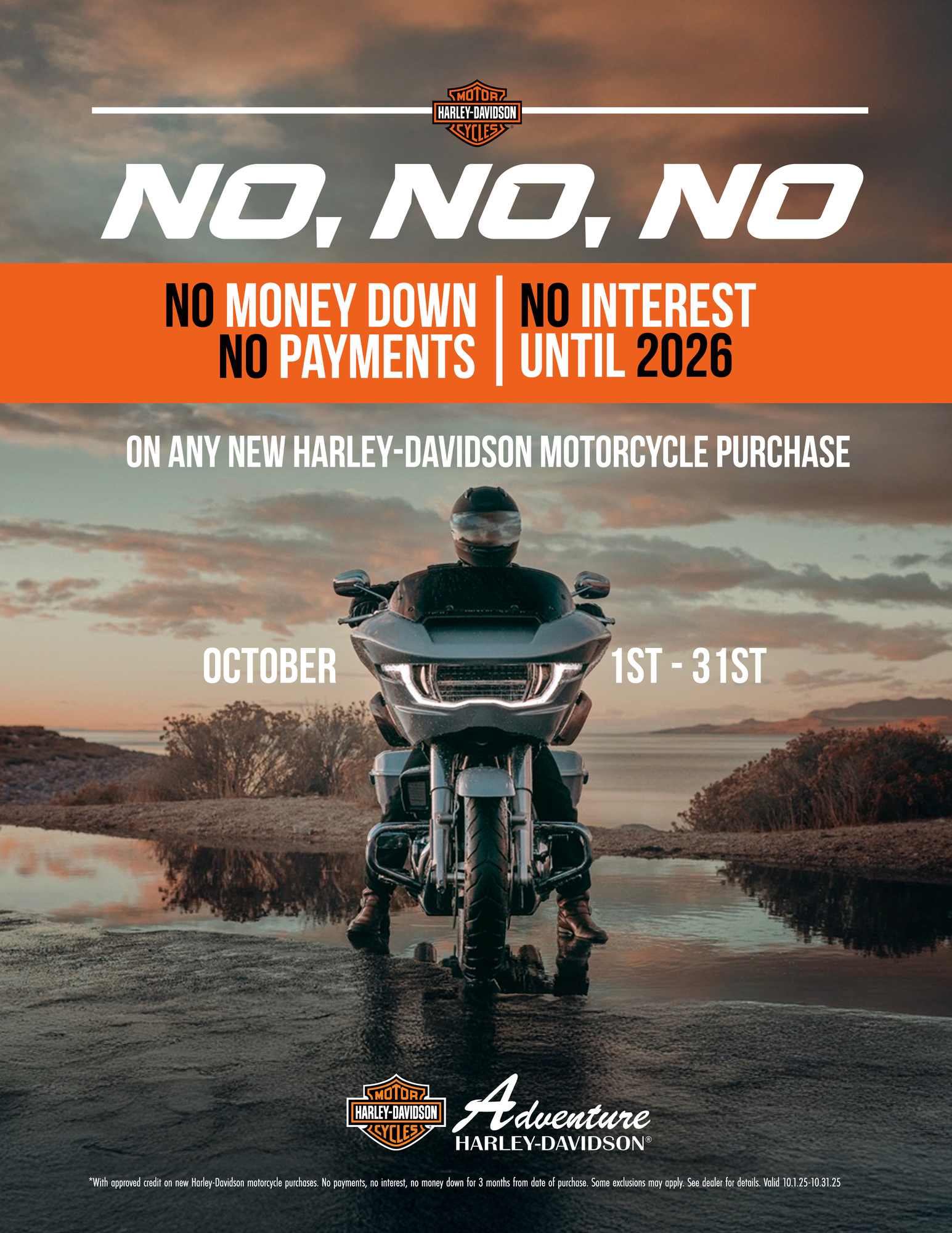 No money down, no interest and no payments until 2026 when you purchase any new Harley-Davidson motorcycle.*With approved credit on new Harley-Davidson motorcycle purchases. No payments, no interest, no money down for 3 months from date of purchase. Some exclusions may apply. See dealer for details. Valid 10.1-31.25